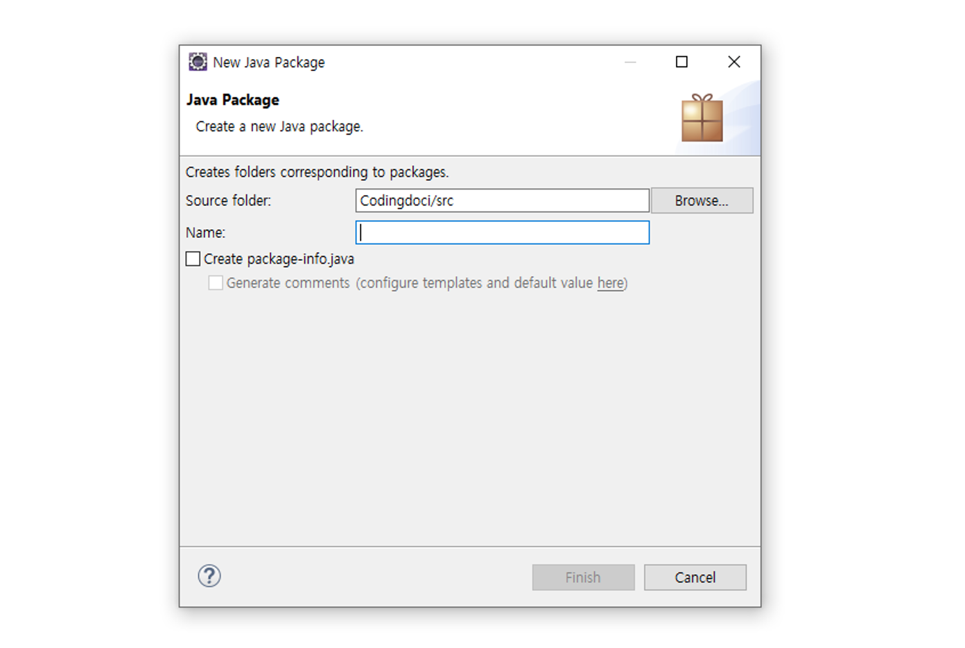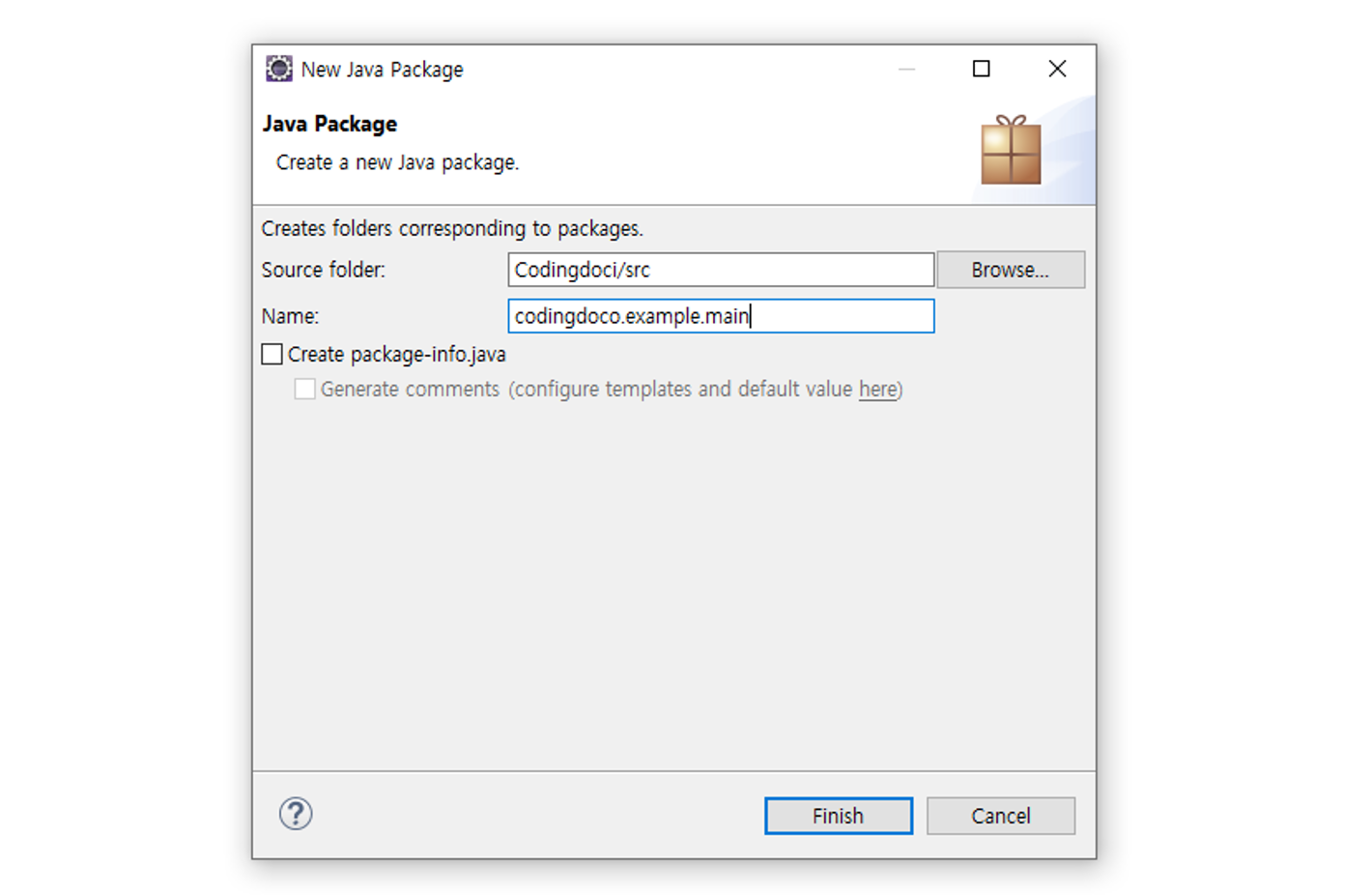 저는 codingdoci.example.main이라는 이름을 설정해주도록 하겠습니다. Finish를 눌러주세요~