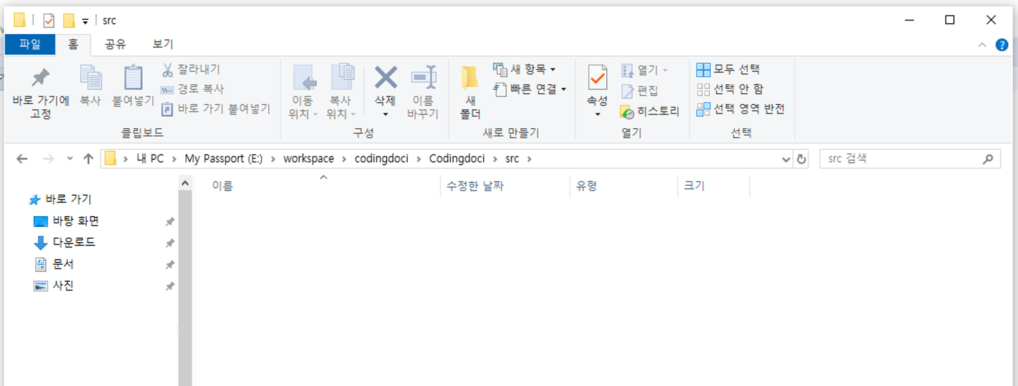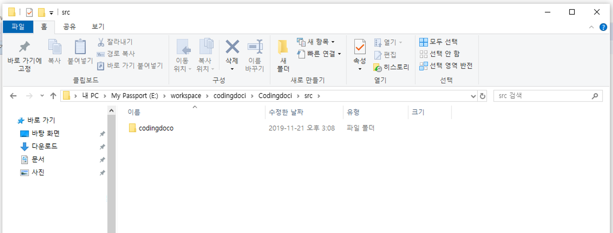 처음에 아무것도 없던 src 폴더 아래에 codingdoci라는 폴더가 생겼네요!