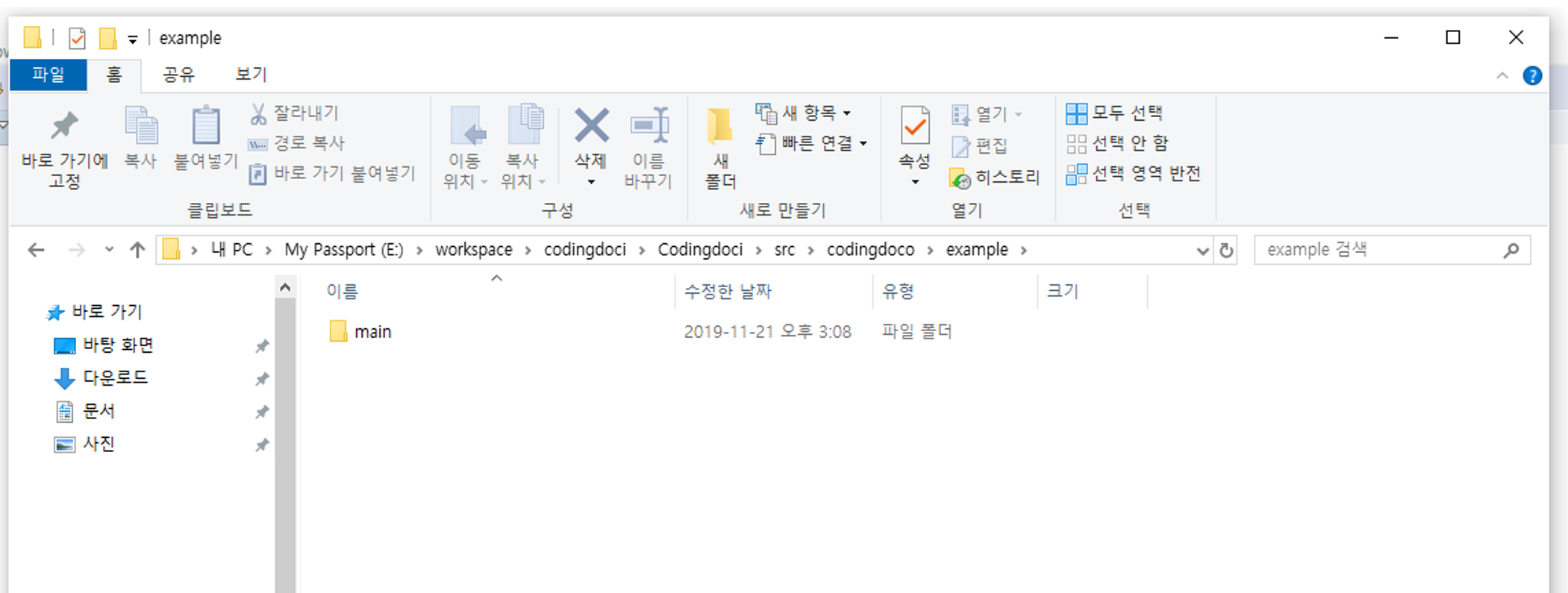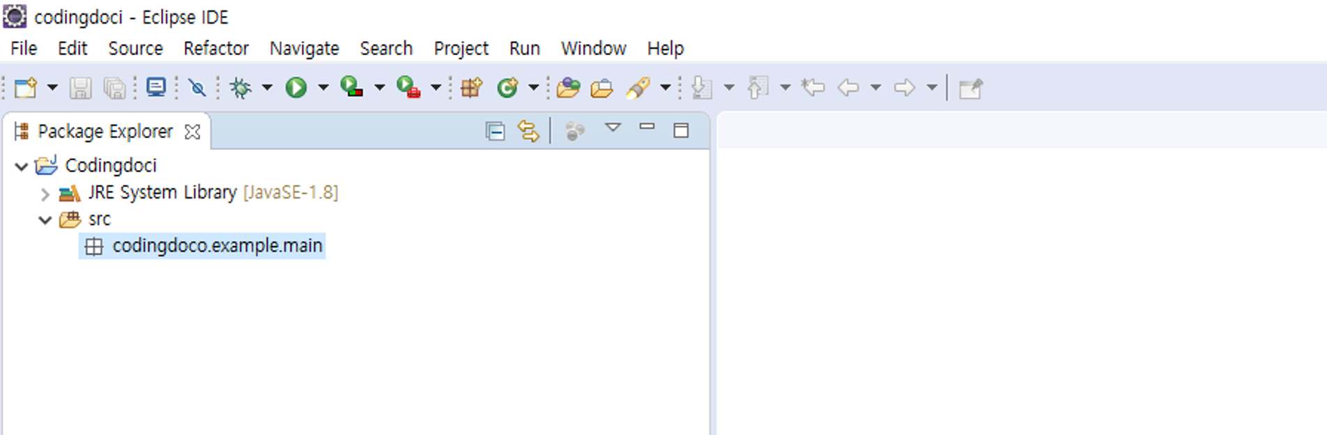 이렇게 제가 설정한 codingdoci.example.main package가 프로젝트에 반영된 것입니다.