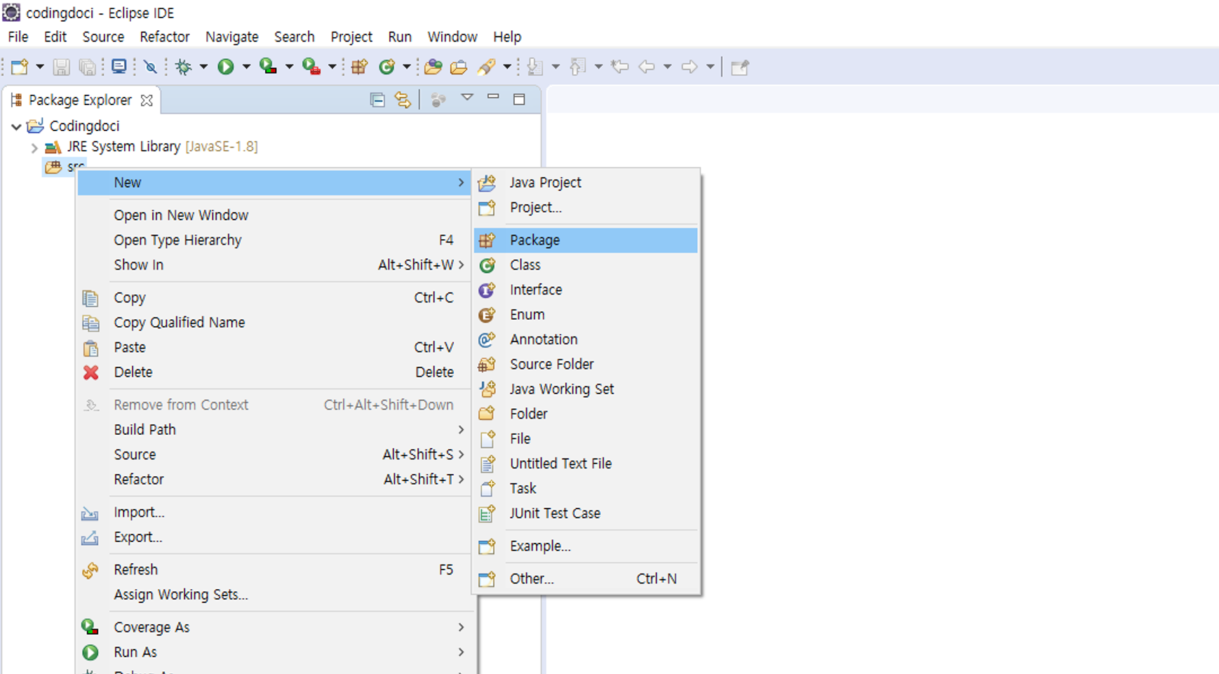 저는 저번 시간에 만들었던 Codingdoci 프로젝트에 package 생성을 해보겠습니다.