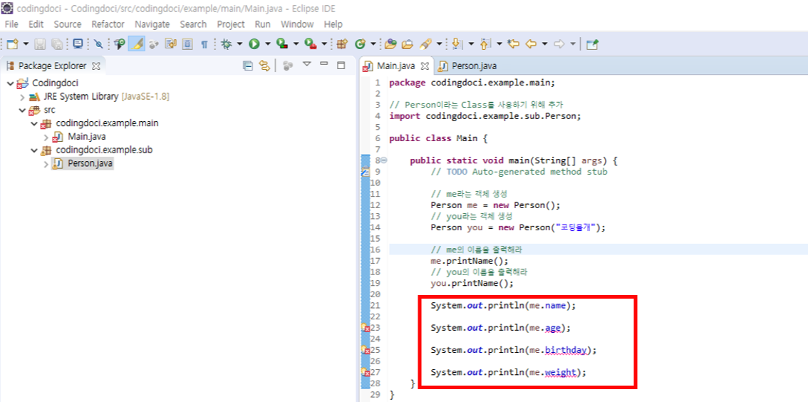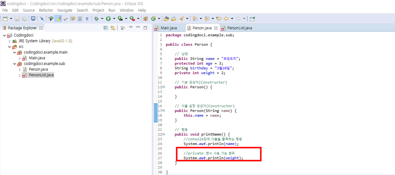Main 클래스에서와 동일하게 Person객체를 하나 생성하고 각각의 변수에 접근해 보았습니다.