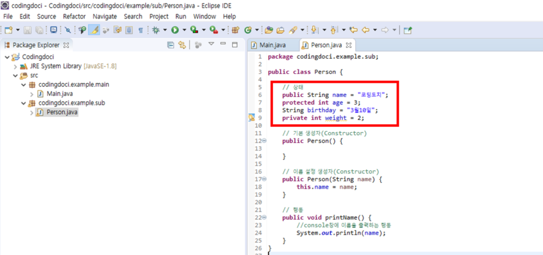 이제 Main 클래스에서 Person 객체를 생성하여 각각의 변수에 접근해보도록 하겠습니다.