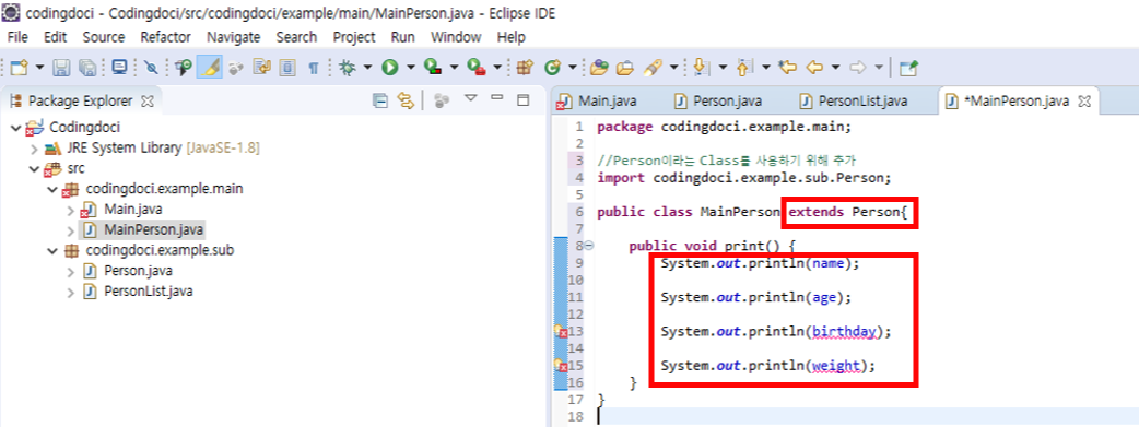 그래서 MainPerson 클래스에서는 name, age, birthday, weight의 변수를 선언하는 부분이 없음에도 불구하고,