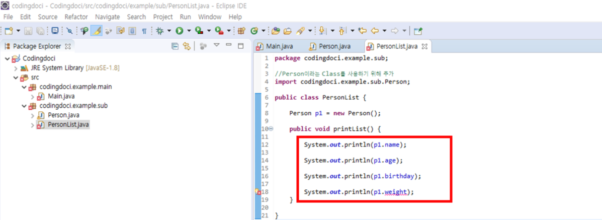 Person 클래스가 있는 패키지에 새로운 PersonList 클래스를 추가해서 확인해보도록 하겠습니다.