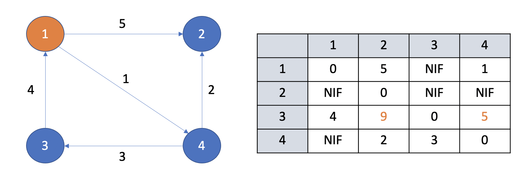 INF와 9 중에서 작은 값을 3번 노드에서 2번 노드로 가는 비용을 갖게 되는 것이죠.