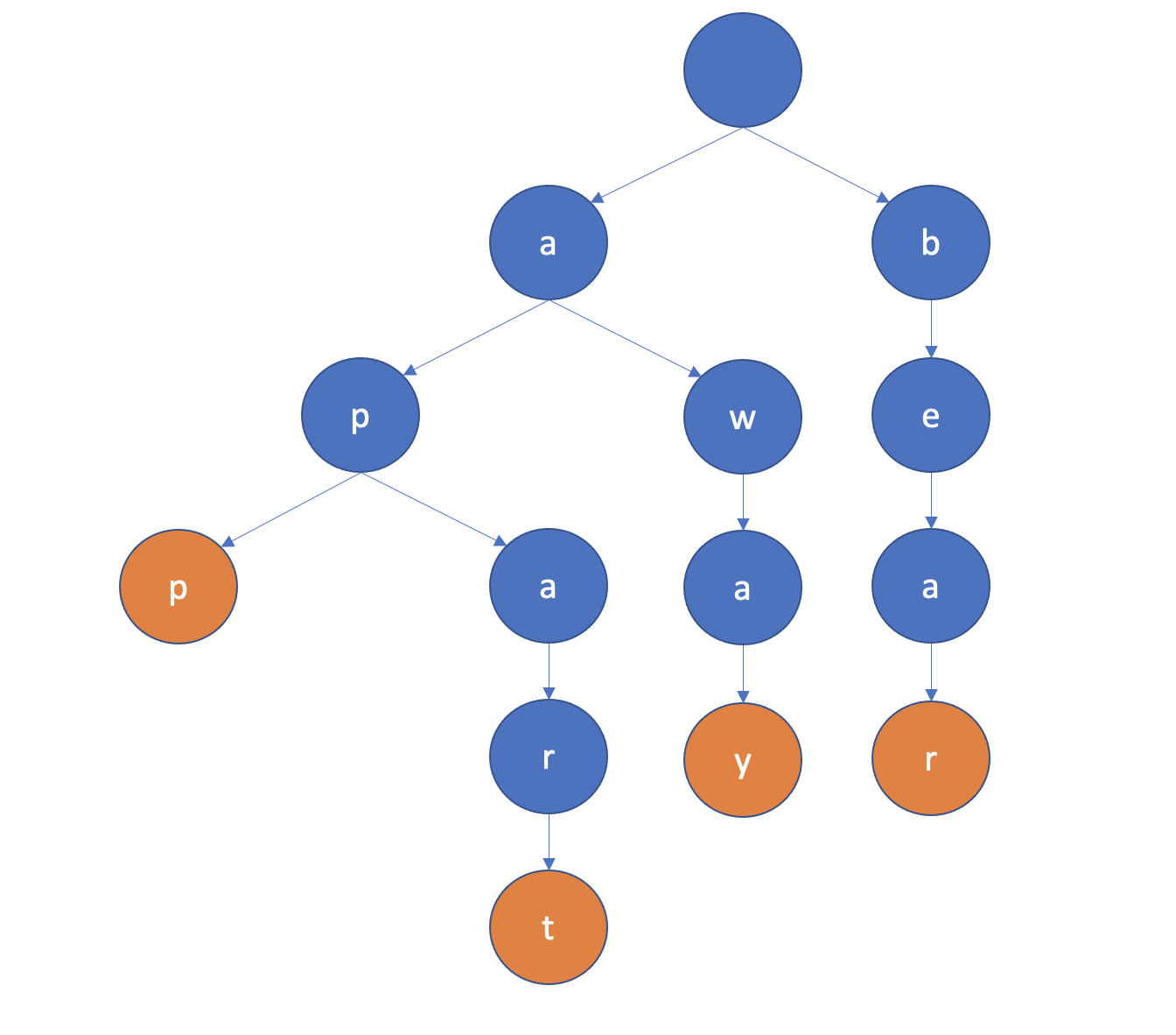 마찬가지 방식으로 apart를 트리 구조에 넣게 되면 되면 다음과 같은 트라이 자료구조가 만들어지게 됩니다.