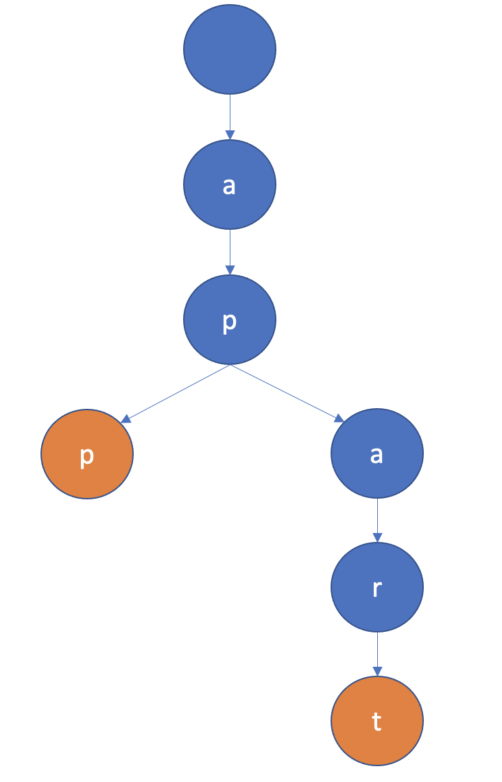 마찬가지 방식으로 apart를 트리 구조에 넣게 되면 되면 다음과 같은 트라이 자료구조가 만들어지게 됩니다.